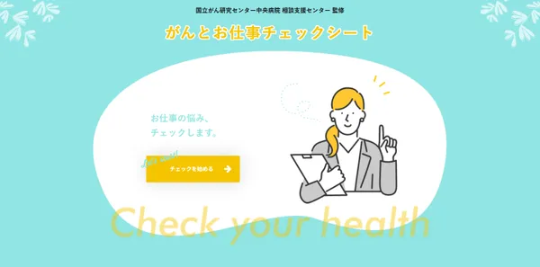 国立がん研究センター中央病院 相談支援センター監修の「がんとお仕事チェックシート」は、仕事との両立でよくある悩み13項目を「はい」「いいえ」「どちらとも言えない」の3択でチェックできる。自身の不安を客観視し、整理をする際に役立つ。